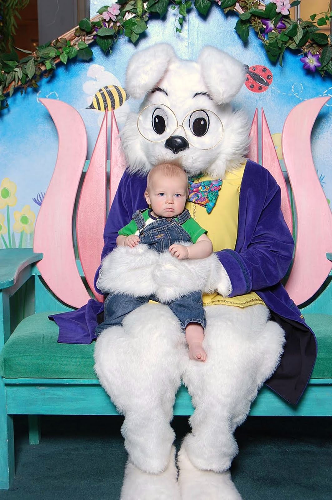 Sunday continued as we met some friends of ours at the Mall to take our boys to meet the Easter Bunny. I have to tell you, my son makes me laugh so hard sometimes. The first thing Squish wanted to do was rip off the bunny’s glasses, then he must have realized he was sitting on what was basically a giant stuffed animal that moved, because he shot us a look like “Um guys, I am not really sure about this”!!