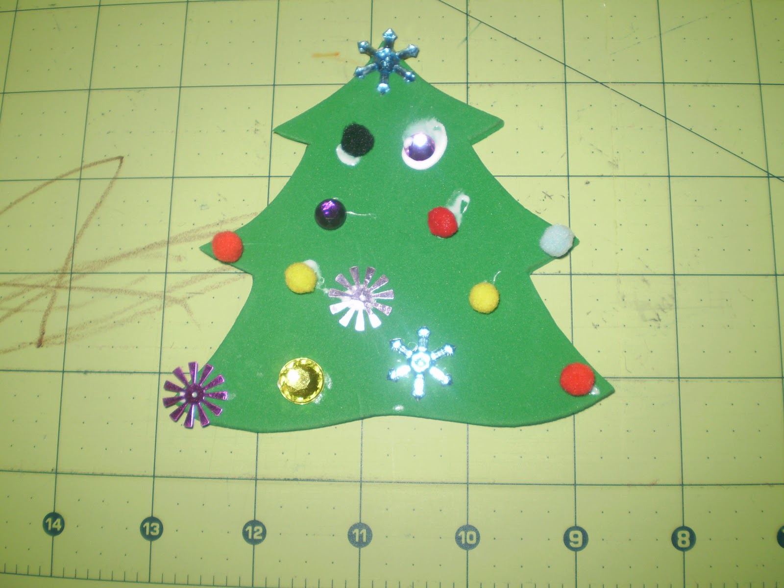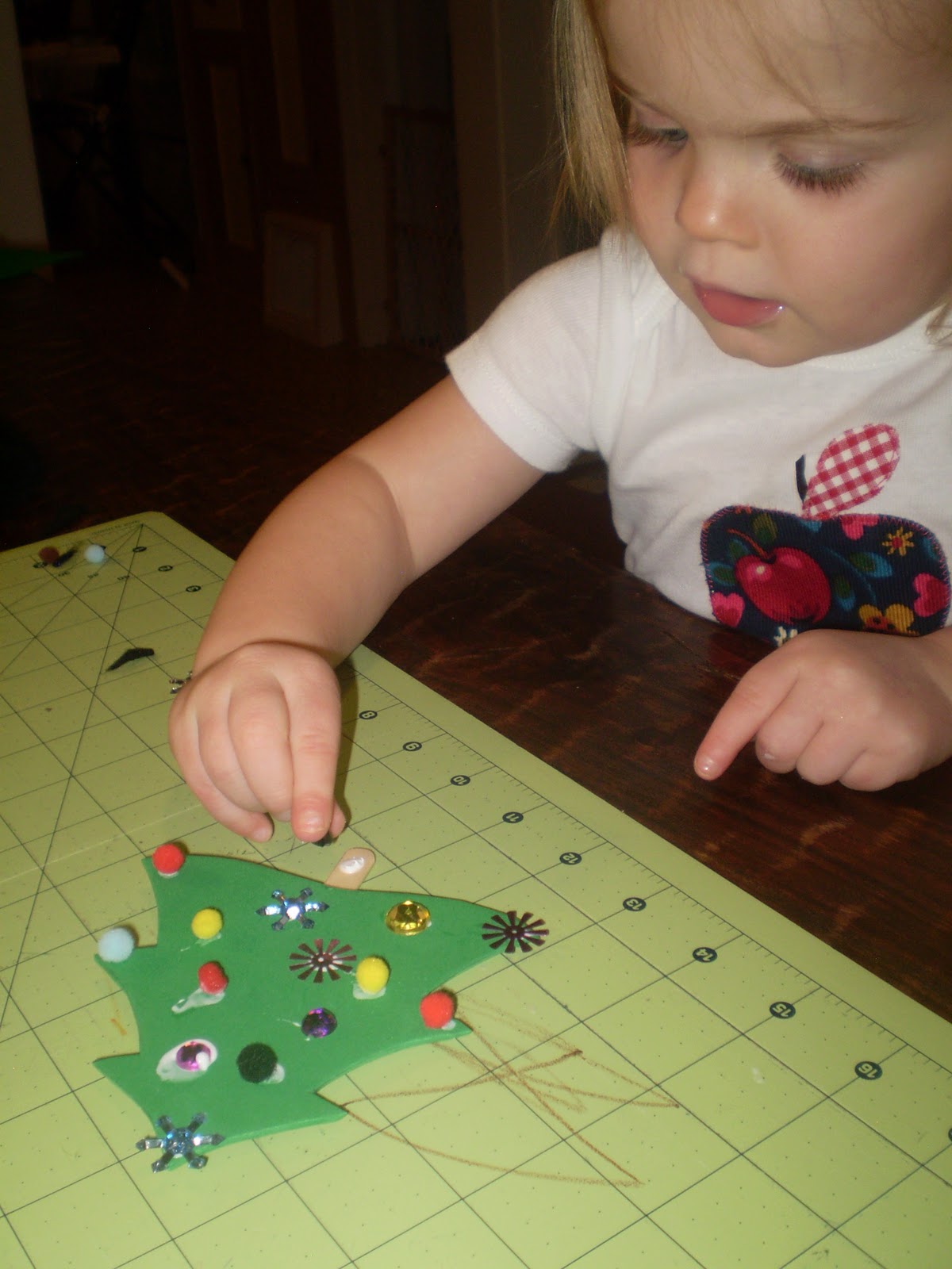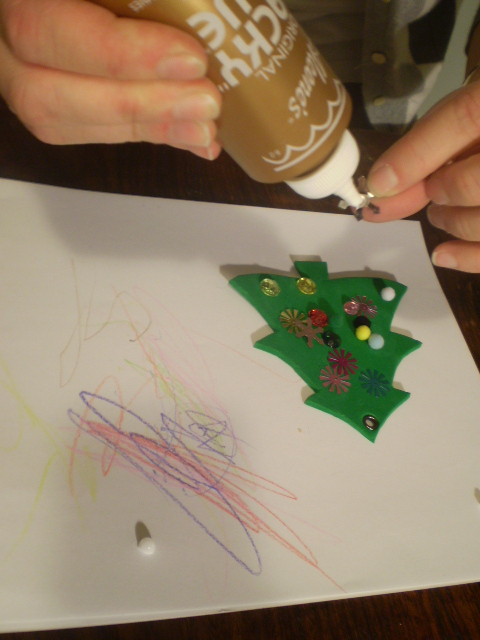 Trace your templates onto the back side of the craft foam and cut out before introducing your toddler to all the shiny, pretty things on the table. They’re like magpies and you’ll end up doing what I did: performing fancy save-the-flying-rhinestone maneuvers with a pair of sharp scissors and a half cut foam tree in your hands. Not exactly a smooth move on my part! (Cut the circle out of the tree to turn your ornament into a picture frame. Just glue a piece of clear vinyl to the back of the tree, add a picture and then attach a second tree to it.)